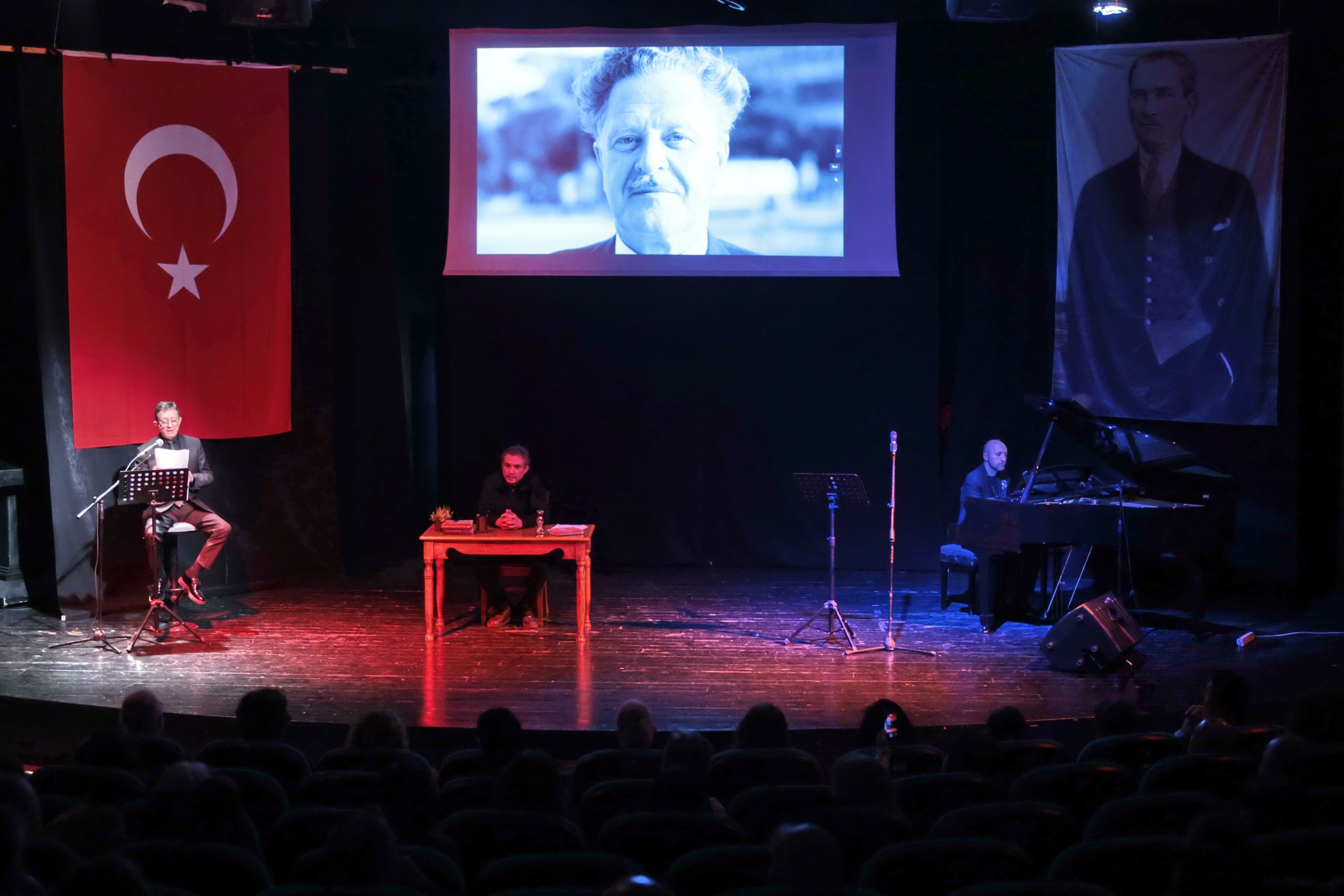 Konak Belediyesi’nin, Nazım Hikmet’in 124’üncü doğum yıl dönümü nedeniyle gerçekleştirdiği Ustaya Saygı etkinliğinde Mavi Gözlü Dev, şiirleriyle anıldı. Türk edebiyatının büyük ustasının eserlerinin hem şiir hem besteleriyle dile geldiği Ustaya Saygı adlı etkinliğe Konak Belediye Başkanı Nilüfer Çınarlı Mutlu ve bürokratları, muhtarlar ve vatandaşlar katıldı. Güzelyalı Nazım Hikmet Kültür Merkezi’ndeki anmada Şair Özgür Zeybek, Nazım’ın hayatından kesitleri hikayeleştirirken Tiyatro Sanatçısı Meftun Yetiş ve tiyatro öğrencisi Eda Akyıldız şiirlerini okudu. Uğur Sayınbatur piyano başında Nazım’ın bestelenmiş şiirlerini seslendirdi; gecenin solistliğini ise Deniz Aygün Araal yaptı.