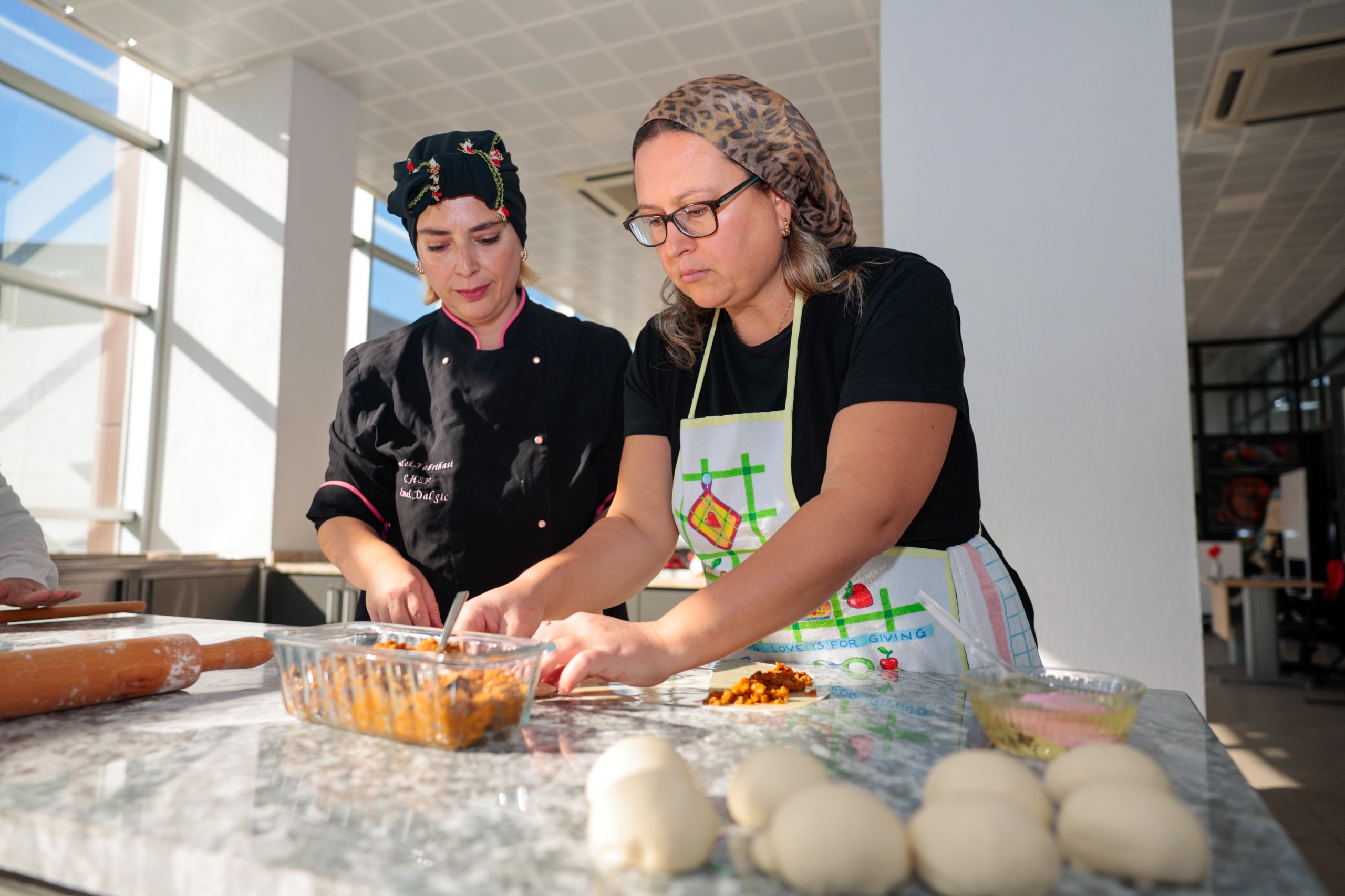 Konak Belediyesi’nin İzmir Büyükşehir Belediyesi Meslek Fabrikasıyla birlikte yürüttüğü eğitim programı kapsamında Toros Sosyal Tesisleri’nde düzenlenen Geleneksel Hamur Ürünleri Yapımı Kursundan mezun olan kadınlar sertifikalarını aldı. Hamur işlerine dair tüm incelikleri öğrenen kadınların mezuniyet gururu yaşadığı sertifika törenine Konak Belediye Başkanı Nilüfer Çınarlı Mutlu’yla birlikte İzmir Büyükşehir Belediyesi Kadın ve Aile Hizmetleri Daire Başkanı Anıl Kaçar, İzmir Büyükşehir Belediyesi Meslek Fabrikası Şube Müdürü Zeki Kapı, Konak Belediyesi Kadın Aile Hizmetleri Müdürü Nursun Akıncı, eğitmenler ve muhtarlar katıldı. Kadın emeğinin hayatın her alanına yayıldığı; kadının güçlü, görünür ve özgür olması adına Meslek Fabrikası ve sivil toplumla sürdürdükleri işbirliklerinin önemine dikkat çeken Başkan Mutlu, dayanışma halinin büyüyerek devam edeceğini dile getirdi. Toros Sosyal Tesisleri’nde hiçbir boş sınıf kalmayacağını ifade eden Başkan Mutlu, kadınların meslek edinmesi ve emeğinin değerlenmesi için var güçleriyle çalıştıklarını söyledi.